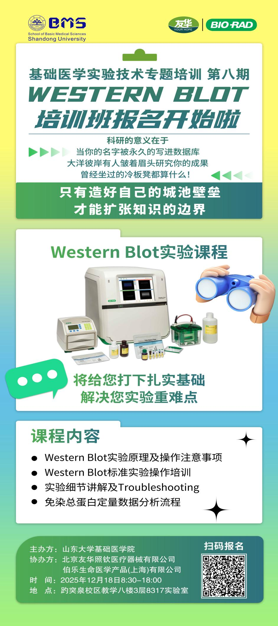 基础医学实验技术专题培训(第八期)开始报名。本期培训内容为Western Blot实验,由学院与BIO-RAD公司联合组织,由多位资深技术老师现场指导学员完成WB全流程,并对实验中发现的问题详细分析原因并提出解决办法。每位学员都将深入参与实验全过程,培训后能达到独立规范完成WB实验、解决常见问题。