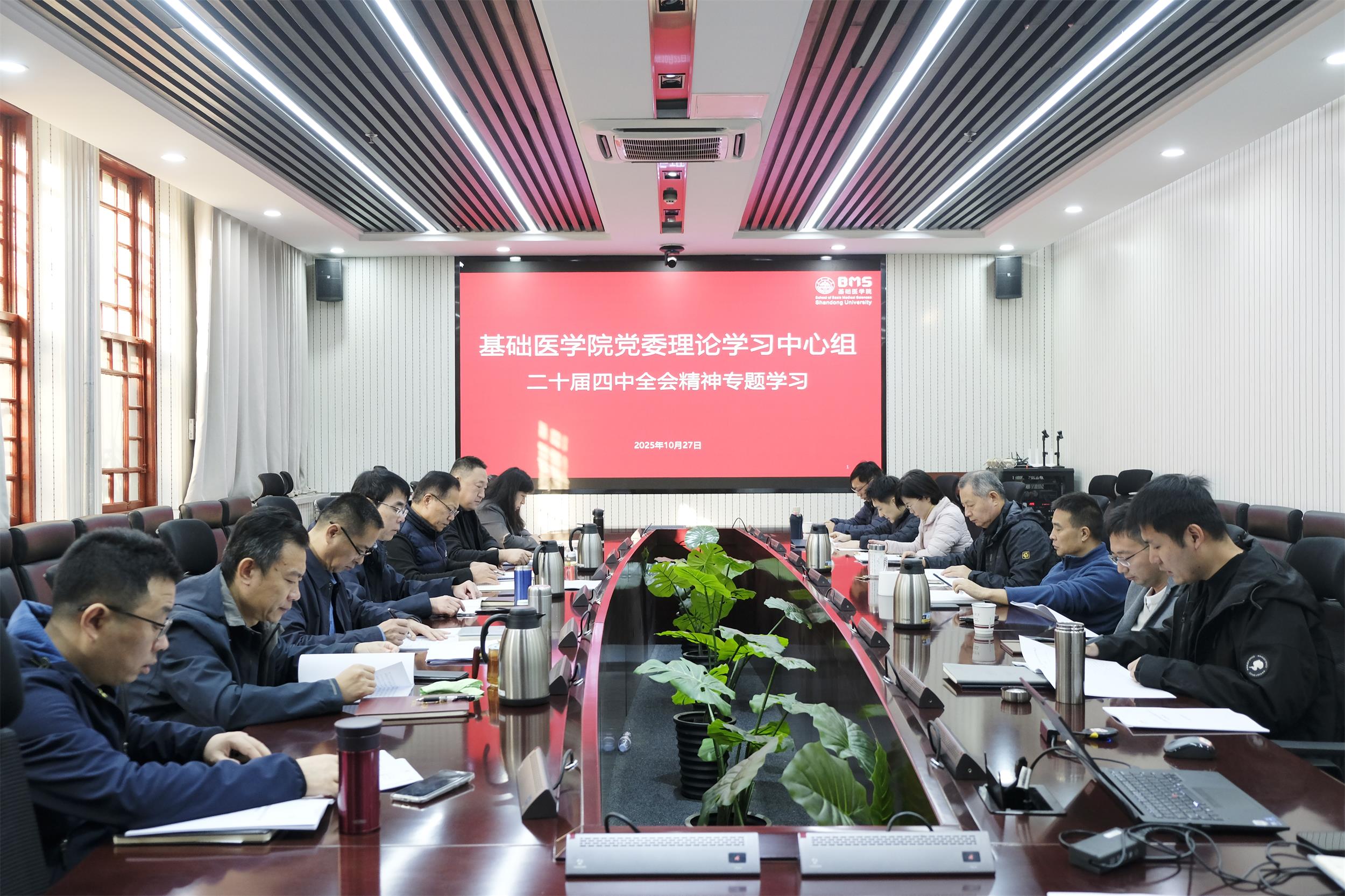 10月27日,基础医学院举行党委理论学习中心组会议,专题学习党的二十届四中全会精神。学院党委书记马宏峰主持会议,院长高成江等全体领导班子成员、理论学习中心组成员参加会议。