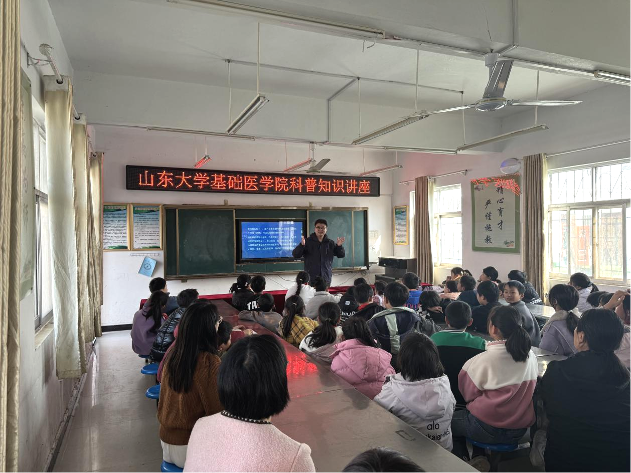 下午,马宏峰一行来到确山县盘龙街道周湾小学看望学校师生。学院医学免疫学系的王嘉宁老师为全体师生做科普讲座。王嘉宁从狂犬病的历史讲起,用通俗易懂的语言引导学生们思考病毒与疫苗的关系,并对生活中常见疾病的预防做了详细科普。同时,他以“成为一名科学家需要具备的素质”为切入点,勉励学生们要以奋战在科研一线的中国科学家为榜样,从小培养勤劳勇敢、持之以恒的精神,为祖国发展贡献自己的力量。