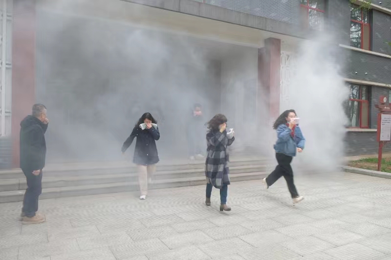 演练分为火灾疏散逃生、灭火器使用、消防栓使用等三个部分。火灾疏散逃生环节,安保人员点燃消防烟雾饼,随着警报声响起,全楼师生利用毛巾捂住口鼻、俯身弯腰,快速、有序按照疏散标识从最近的逃生通道撤离火灾现场。灭火器和消防栓的使用环节,工作人员首先讲解了干粉灭火器、二氧化碳灭火器和消防栓的使用方法和注意事项,随后全体师生分组进入灭火区域,轮流亲手操作灭火器和消防龙头进行灭火演练。整个演练过程严肃、认真、紧张、有序,达到了演练的预期效果。