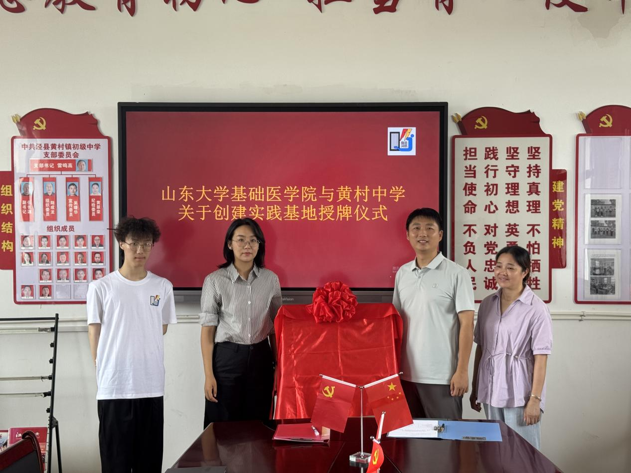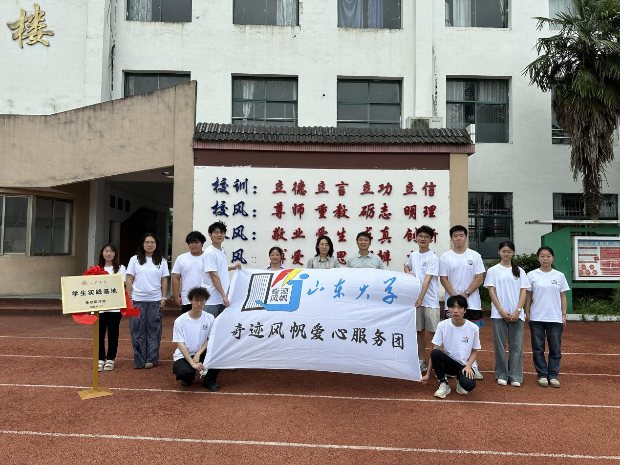 7月12日,基础医学院与安徽省宣城市泾县黄村中学(黄村中学)共建大学生社会实践基地签约暨揭牌仪式在黄村中学举行。黄村中学校长吴通,基础医学院团委负责人赵景琳共同为基地揭牌,并代表双方签署共建协议。黄村中学相关领导与山东大学奇迹风帆爱心服务团“泾帆启梦”支教队全体队员参加仪式。
