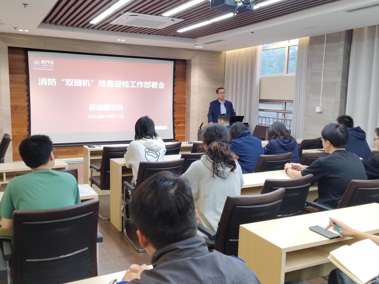10月17日,基础医学院举办2025年秋季消防安全培训会与济南市消防救援支队消防“双随机、一公开”检查迎检工作部署会。此次培训邀请趵突泉校区公安处杜春兴科长担任主讲嘉宾,学院志愿消防队员、各物理空间安全小组协调人、各教学科研团队安全员老师及研究生小组长50余人参加活动。学院党委副书记张乃亭主持会议。