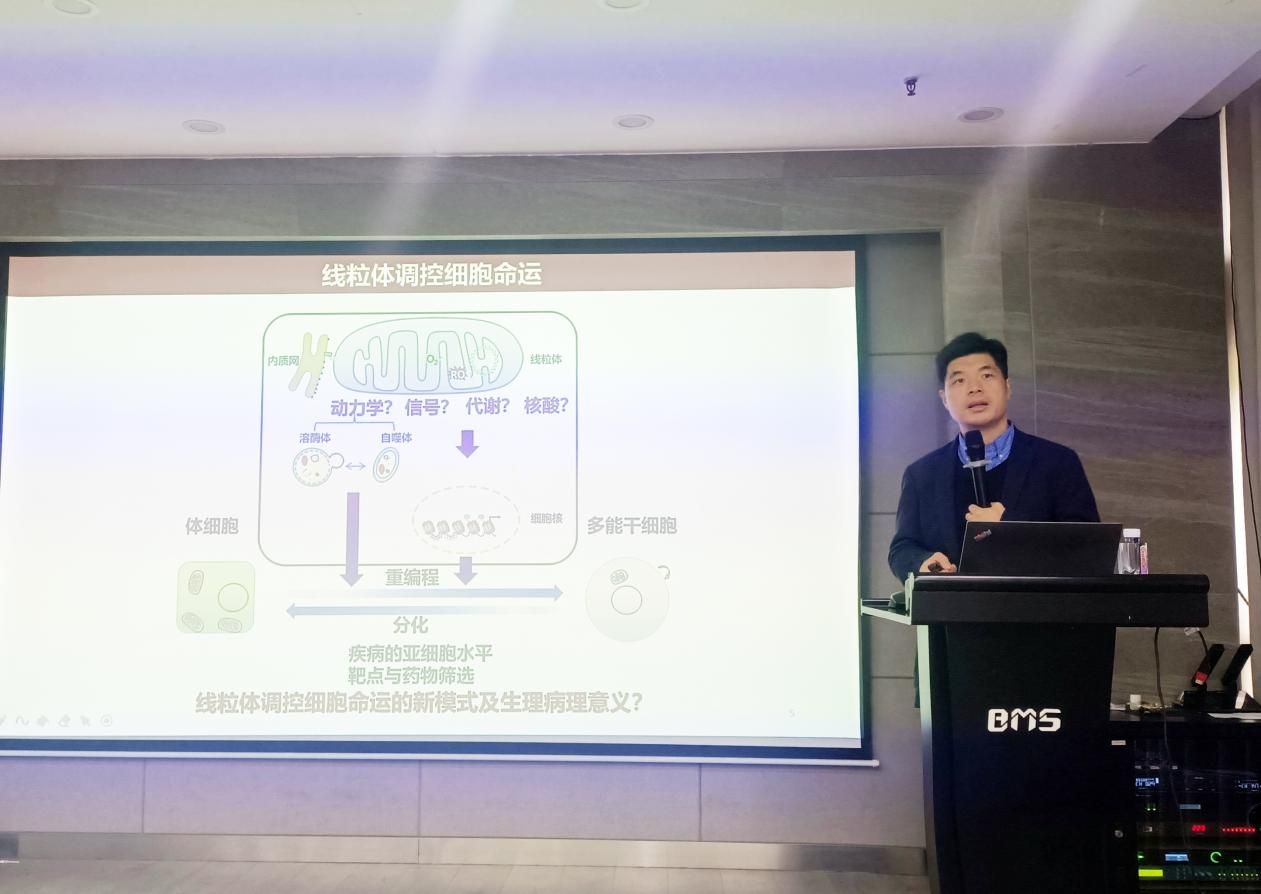 刘兴国研究员系统阐述了其团队在“线粒体与细胞命运调控”领域的最新进展。他介绍,团队发现线粒体基因CYTB可编码一种新型功能蛋白CYTB-187AA,通过调控NAD⁺代谢与HIF1α信号显著提升体细胞重编程效率,提出“线粒体约定(mPACT)”理论,突破了线粒体基因组仅编码13种蛋白的传统认知。同时,研究还揭示线粒体相变、代谢信号释放及UPRᵐᵗ表观互作等机制在干细胞命运和疾病耐药中的关键作用,为能量代谢与表观调控的整合研究提供了新思路。报告结束后,刘兴国研究员与现场师生就线粒体RNA转运至胞质的可能机制及线粒体荧光标记物的设计与应用进行了深入交流与讨论,现场气氛热烈。