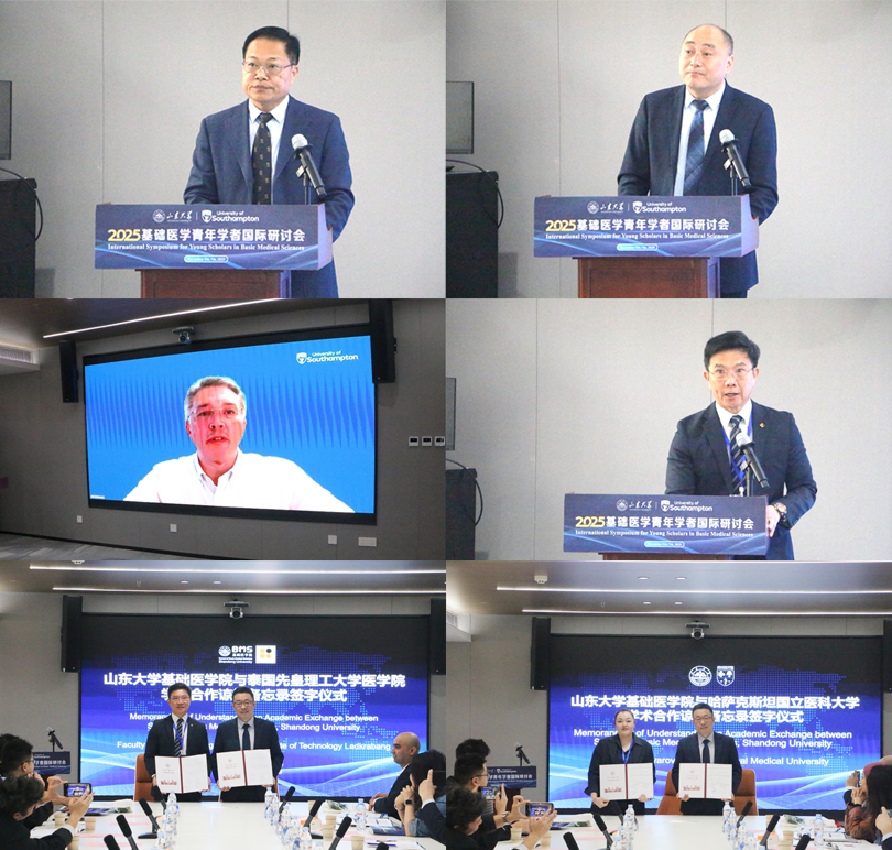 11月6日上午,基础医学青年学者国际研讨会开幕式在综合楼举行。基础医学院党委书记马宏峰、齐鲁医学院科研与国际合作办公室副主任汤煜春、英国南安普顿大学生物科学学院院长Phil Williamson(视频)、泰国先皇理工大学医学院院长Anan Srikiatkhachorn出席开幕式并致辞。马宏峰简要介绍了基础医学院的总体概况与办学理念,并鼓励与会青年学者畅所欲言、交流学术思想,共谋创新,携手进步。汤煜春回顾了齐鲁医学院悠久的历史与取得的丰硕成果,鼓励青年学者充分利用本次研讨会搭建的交流平台,分享成果、碰撞思想,在探索医学真理中成长。Phil Williamson院长通过视频致辞回顾了两院之间的友好交流历程,并希望两院在现有交流基础上不断加强合作,取得更多的交流成果。Anan Srikiatkhachorn院长表达了未来与基础医学院开展学术交流与合作的期待。此外,基础医学院与泰国先皇理工大学医学院、哈萨克斯坦国立医科大学分别签署了合作交流备忘录,基础医学院副院长刘尚明代表学院出席签字仪式并签署协议。