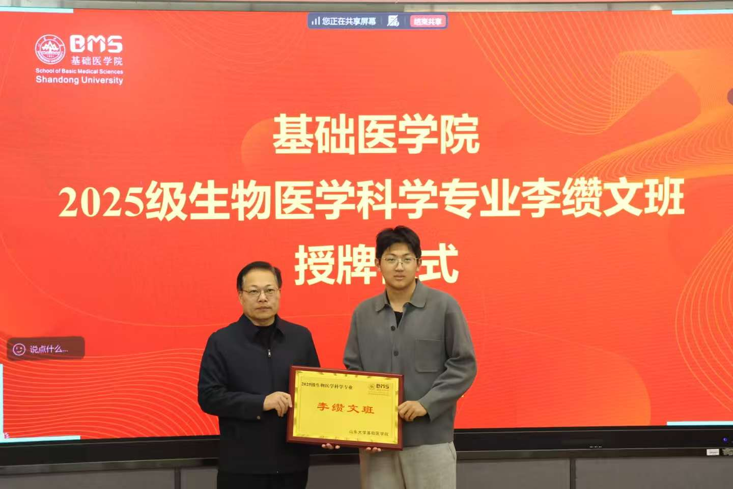 仪式上,学院副院长刘尚明宣读《基础医学院关于以学院历史名人命名生物医学科学专业班级的决定》,马宏峰为2025级生物医学科学专业李缵文班授牌。