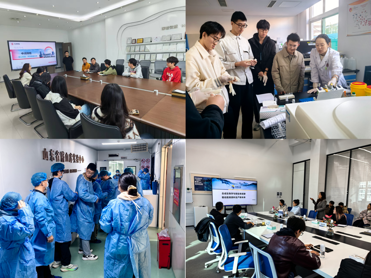课程首站走进山东数字人科技有限公司,在企业专家指导下,同学们系统学习数字解剖技术的原理与应用,并动手完成数字人体解剖作品创作,参与心肺复苏等急救实战演练,实现理论认知向实践能力的转化提升。在山东中鸿特检生物科技有限公司,同学们实地参观万级洁净车间,观摩体外诊断试剂生产全流程,通过专家讲座深入了解试剂盒研发过程。在山东省血液中心,同学们系统学习成分血制备、献血服务及血友病诊疗等专业知识,并动手完成血友病分型与凝血因子XIII检测实验。在山东省齐鲁干细胞工程有限公司,同学们参观了目前世界储存量最大的脐带血库,从科普展示到冻存实践、从前沿科研到产业化挑战,全面认识了干细胞技术的应用现状与发展前景;在华熙生物科技股份有限公司,技术总监以第四代透明质酸生产技术为例,为同学们讲解了“研发-转化”一体化的产业模式。