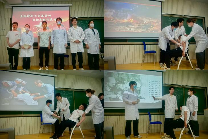 在情景剧演绎环节,团支部成员深情演绎白求恩大夫在晋察冀边区战地开展输血救治的感人故事。炮火中的坚守、义无反顾的献血、严谨细致的诊疗,生动再现了白求恩“毫不利己,专门利人”的国际共产主义精神,让在场团员深刻感悟医者初心与责任。